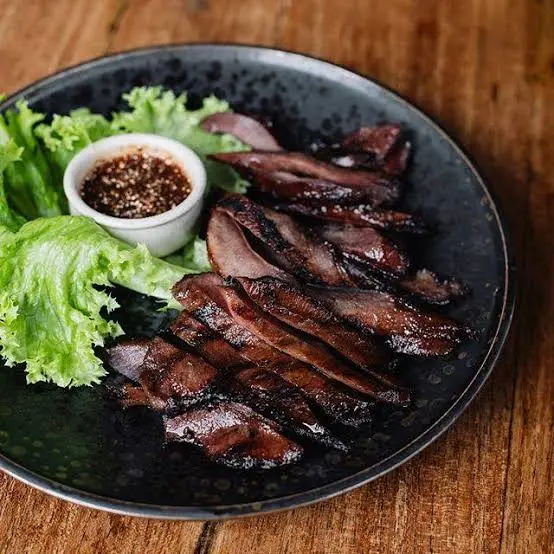 Freshly grilled marinated beef strips dipping in special homemade sauce served with mix leaves, cucumber, carrots and grilled potatoes